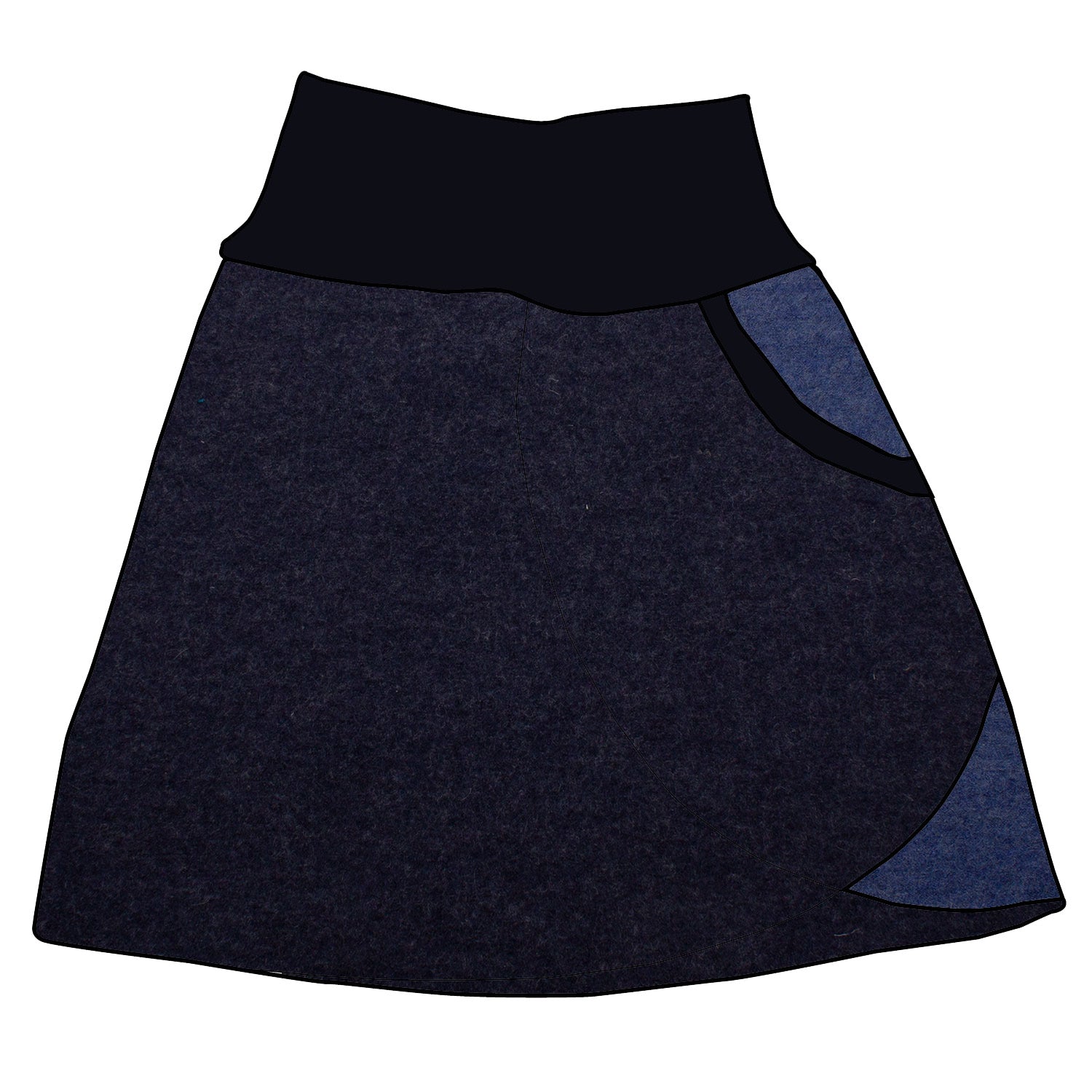 Der Damen falsche Wickelrock in Dunkelblau meliert ist ein echtes Highlight. Hergestellt aus wärmeregulierendem, wasserabweisendem und strapazierfähigem Wollwalk. Erhältlich in Größen 34 bis 48, mit Kombifarbe der Taschenseite nach Wahl. Der weiche Stoff und das elastische Bauchbündchen sorgen für höchsten Tragekomfort. Die große Tasche bietet viel Platz für kleine Schätze. Empfohlen wird das Tragen unter Walkkleidung mit Leggings oder Strumpfhose, um Kratzgefühl zu vermeiden.