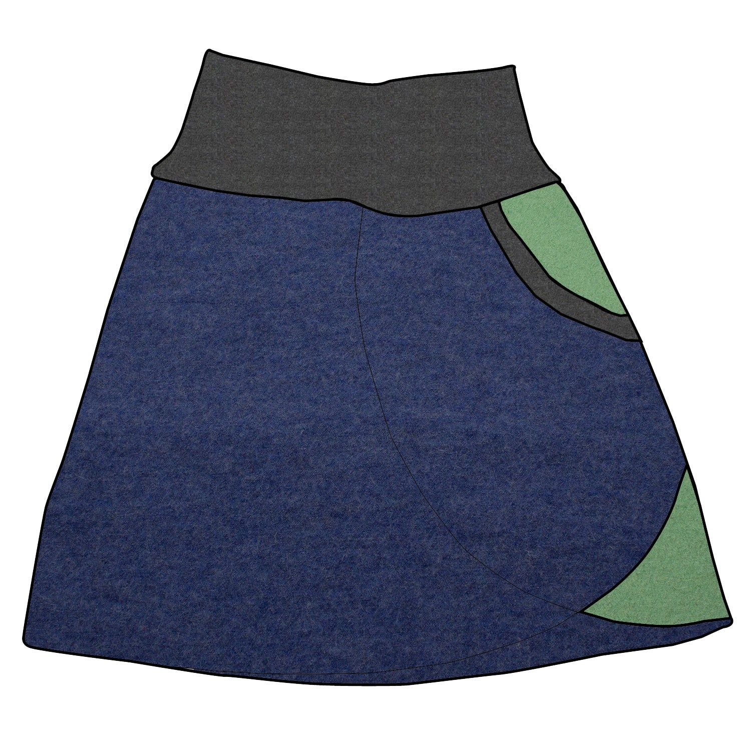 Der Wollwalkstoff reguliert die Wärme und macht den Rock ideal für Frühling, Herbst und Winter. Das elastische Bauchbündchen sorgt für eine perfekte Passform, ohne zu drücken. Der Rock sieht aus wie ein Wickelrock, wird aber ganz normal angezogen und bietet mit einer großen Tasche viel Platz für kleine Schätze oder unverzichtbare Wegbegleiter.