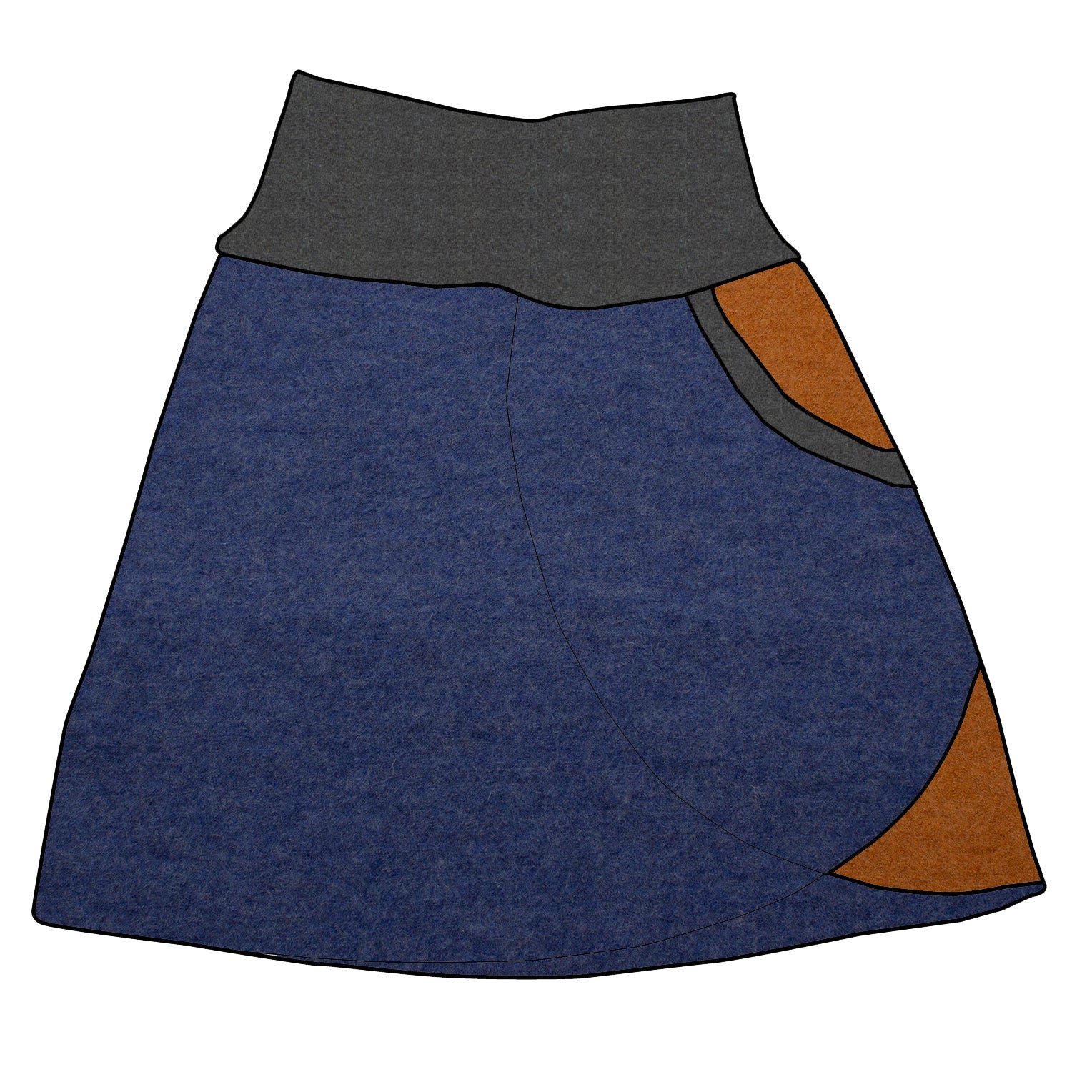 Der Wollwalkstoff reguliert die Wärme und macht den Rock ideal für Frühling, Herbst und Winter. Das elastische Bauchbündchen sorgt für eine perfekte Passform, ohne zu drücken. Der Rock sieht aus wie ein Wickelrock, wird aber ganz normal angezogen und bietet mit einer großen Tasche viel Platz für kleine Schätze oder unverzichtbare Wegbegleiter.