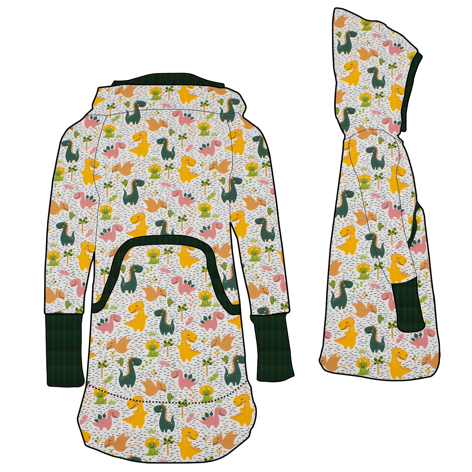 Das Damen Retrokleid Dinoland Rosa ist aus weichem Jerseystoff gefertigt und ideal für jede Saison. Erhältlich in den Größen 34 bis 48 und in den Varianten Kapuze oder Kuschelkragen. Wählen Sie Ihr persönliches Design und lassen Sie sich das Kleid individuell bei MiMaMäuschen anfertigen – für ein einzigartiges Tragegefühl.