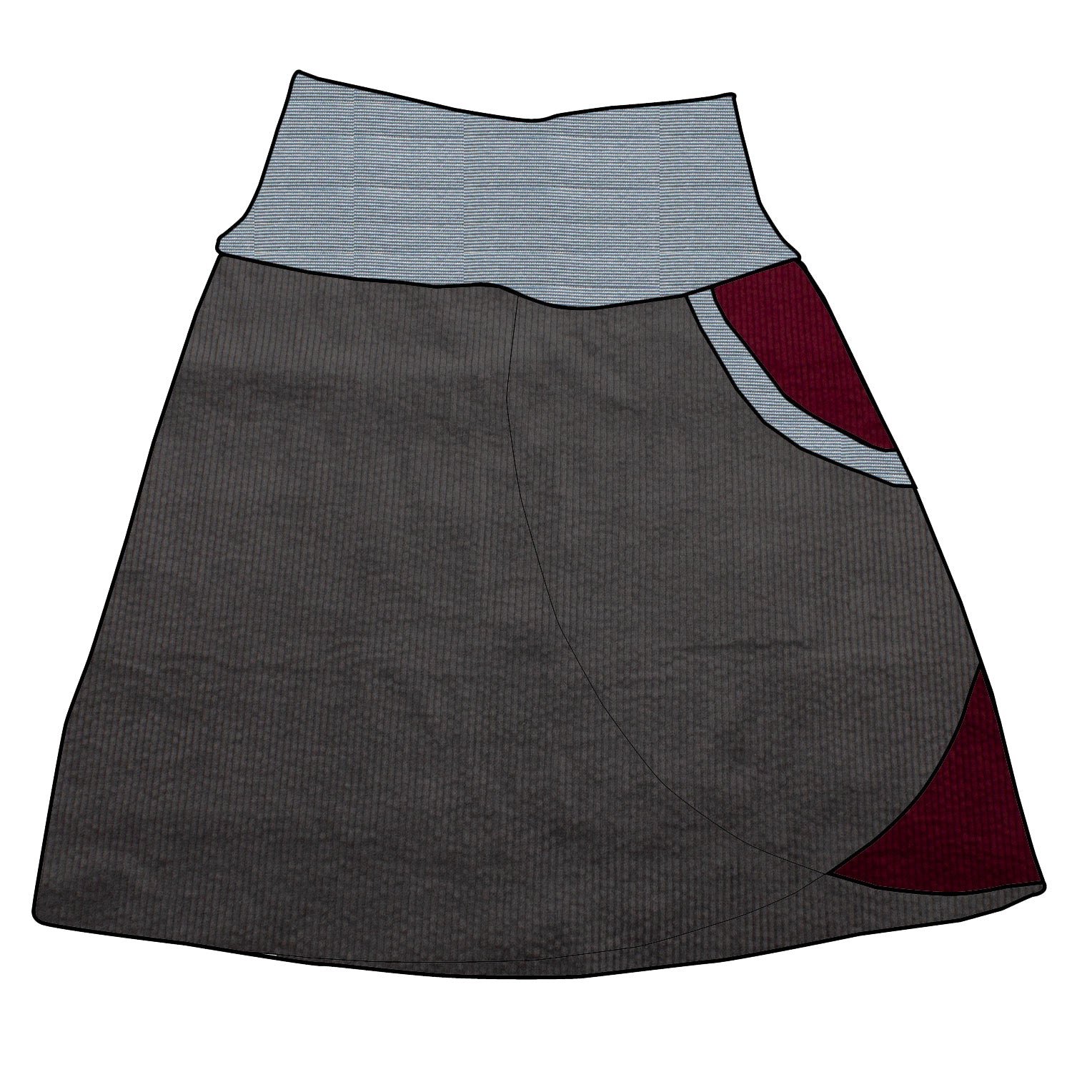 Der falsche Wickelrock aus Cord begleitete die kleinen Entdecker im Frühling und Sommer mit Leichtigkeit. Die Taschenseite konnte in einer Kombifarbe nach Wahl verändert werden.