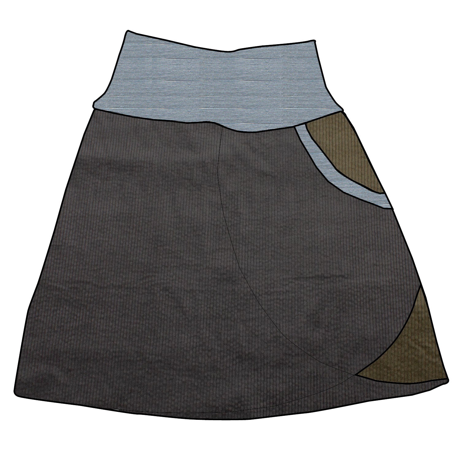 Der falsche Wickelrock aus Cord begleitete die kleinen Entdecker im Frühling und Sommer mit Leichtigkeit. Die Taschenseite konnte in einer Kombifarbe nach Wahl verändert werden.