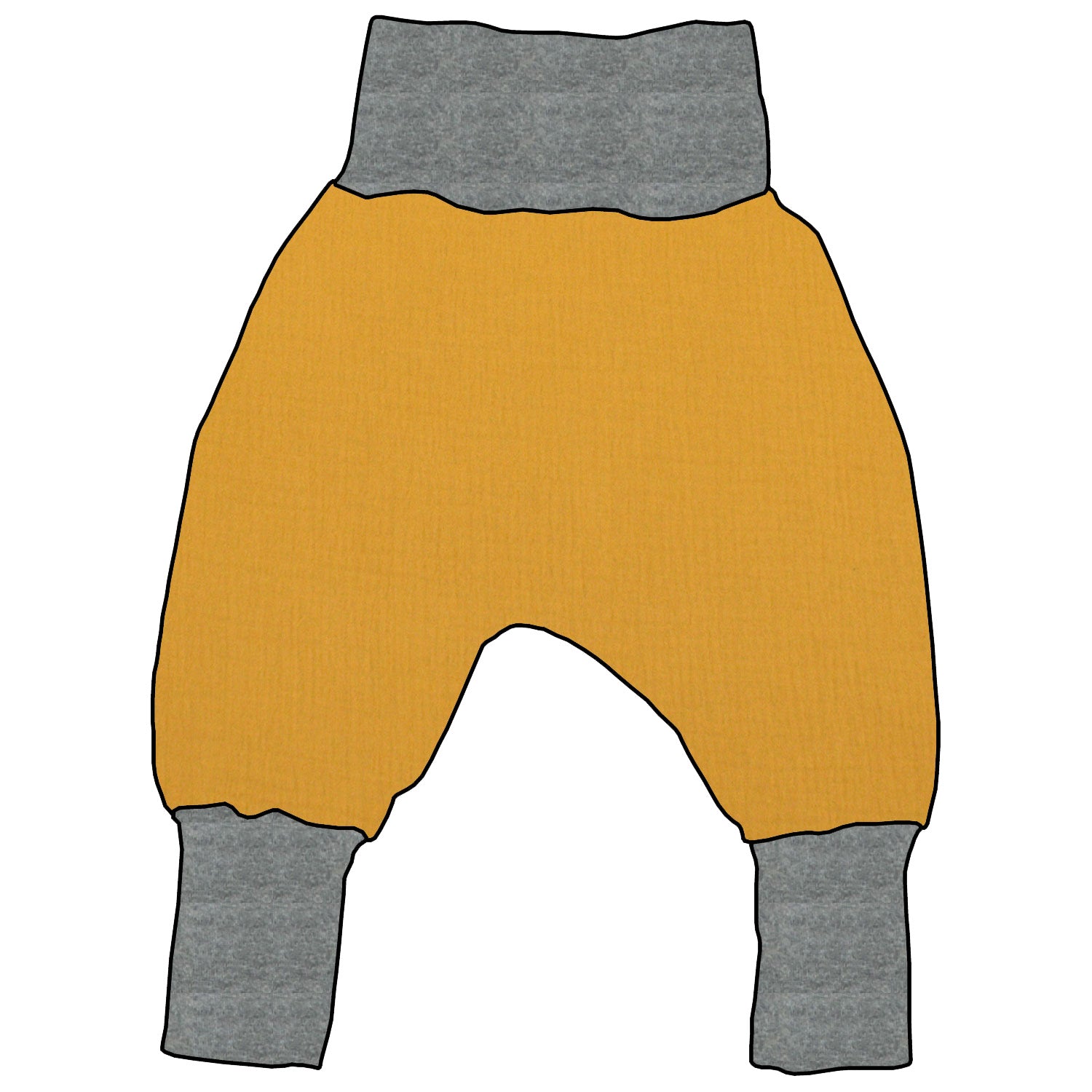 Die Kinder Mitwachshose aus luftigem Musselinstoff in Senf ist ideal für Kinder, die gerne draußen spielen und sich bewegen. Mit verstellbarem Bund und verschiedenen Größen von 44 bis 122 wächst sie mit dem Kind mit. Die bequeme Pumphose ist perfekt für alle Jahreszeiten und kann online bei MiMaMäuschen bestellt werden.
