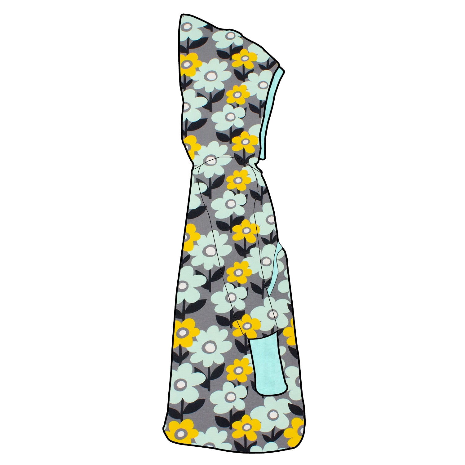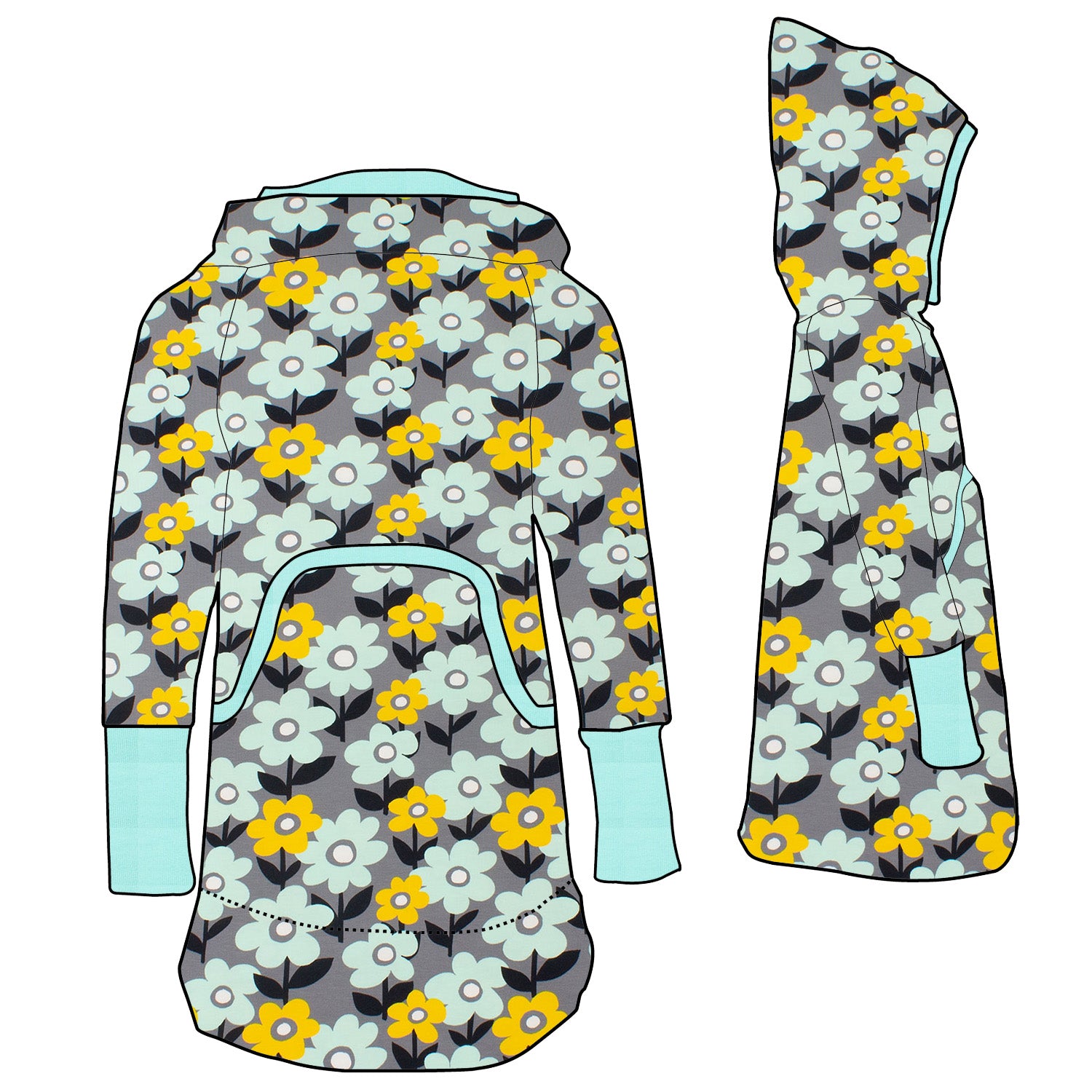 Das Retrokleid war aus hochwertigem Jerseystoff gefertigt und mit einem bezaubernden Retro Blumenmuster verziert. Die Größen reichten von 74/80 bis 158/164, und die Kinder hatten die Wahl zwischen einer trendigen Kapuze oder einem kuscheligen Kuschelkragen.